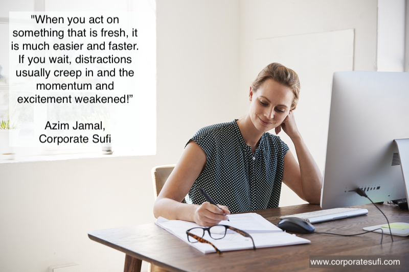 When you act on something that is fresh, it is much easier and faster. If you wait, distractions usually creep in and the momentum and excitement weakened!