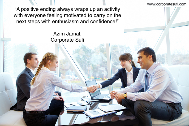 8. Ideally try to end the meeting on a positive note. Whether it’s commending someone on their contribution or highlighting group effort at a previous task, a positive ending always wraps up an activity with everyone feeling motivated to carry on the next steps with enthusiasm and confidence.