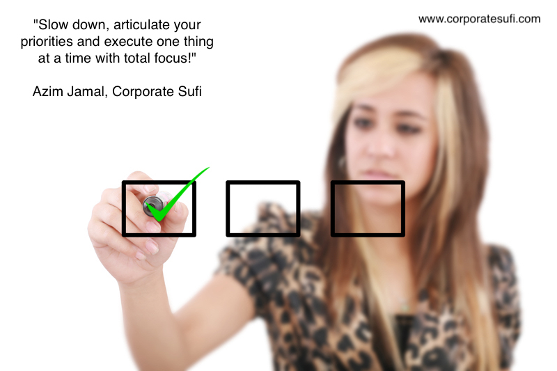 Systematic execution in order of priority, with total focus on the task at hand, leads to a better outcome. Therefore, slow down, articulate your priorities and execute one thing at a time with total focus!